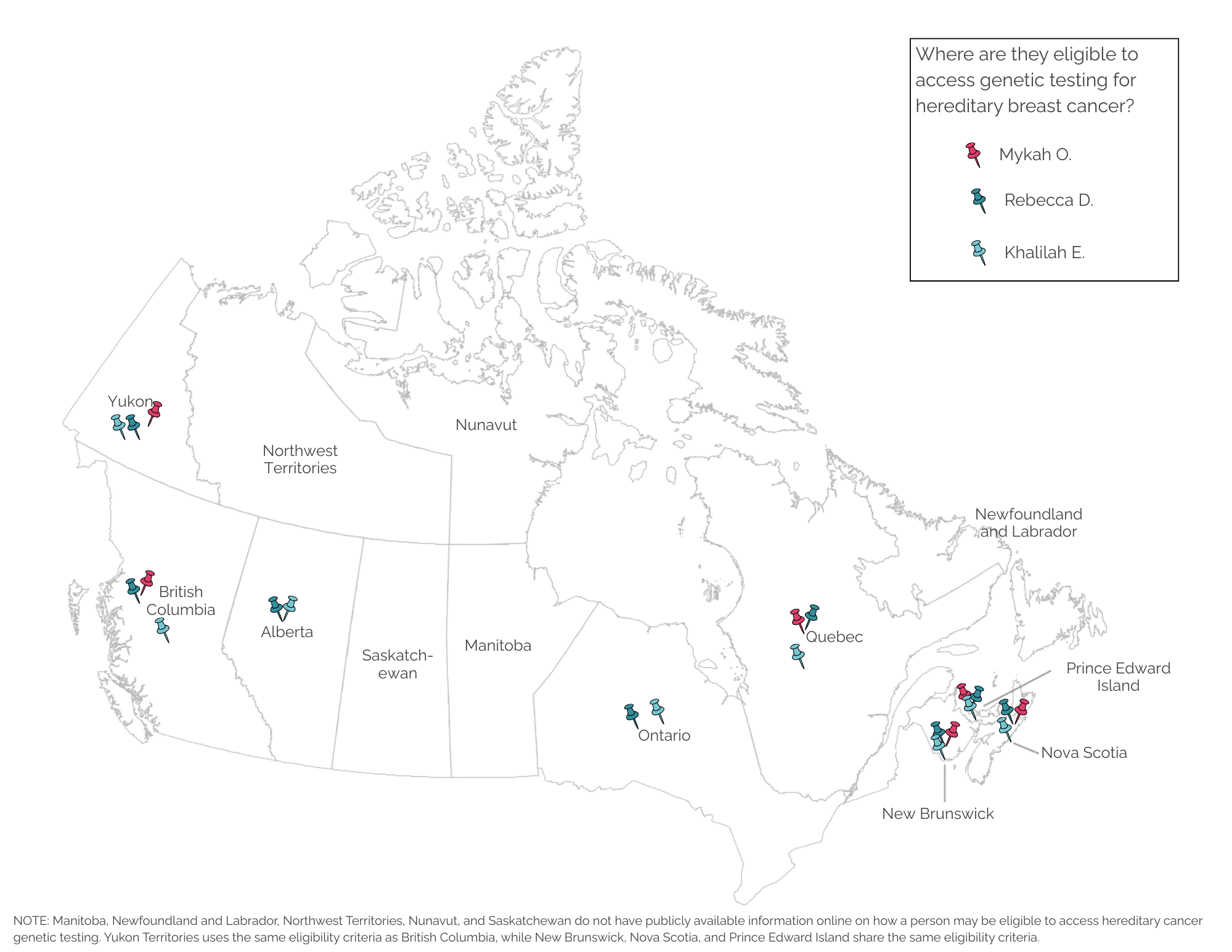 Based on the provinces and territories that share publicly available information on the eligibility criteria to access genetic testing for hereditary breast cancer, there isn’t a province or territory that Khalilah would not be currently eligible to access genetic testing in.
