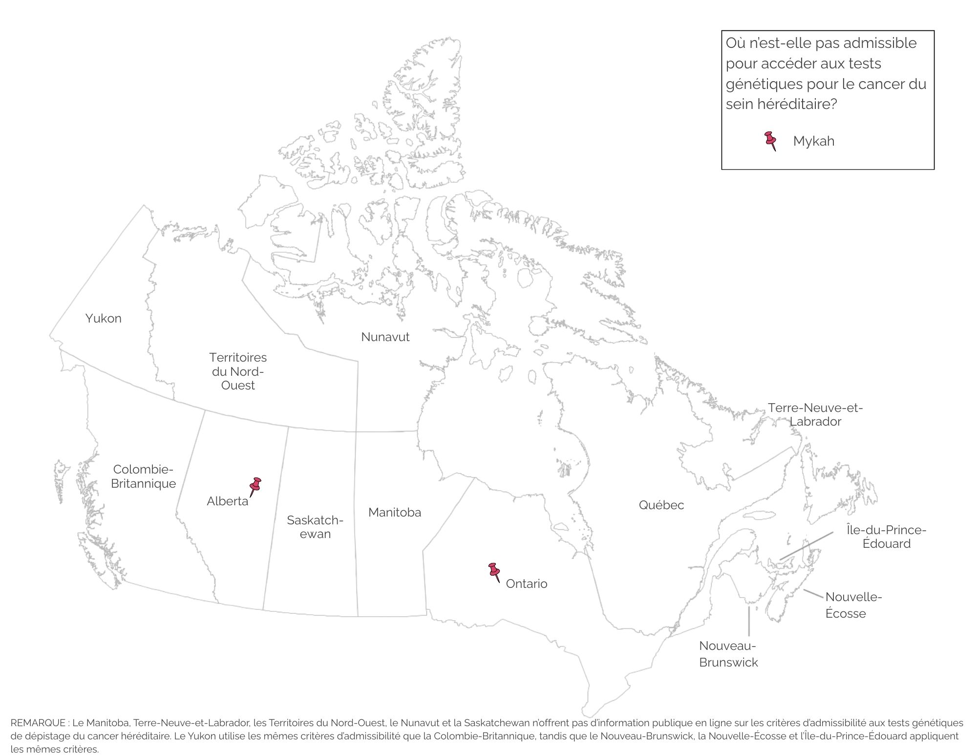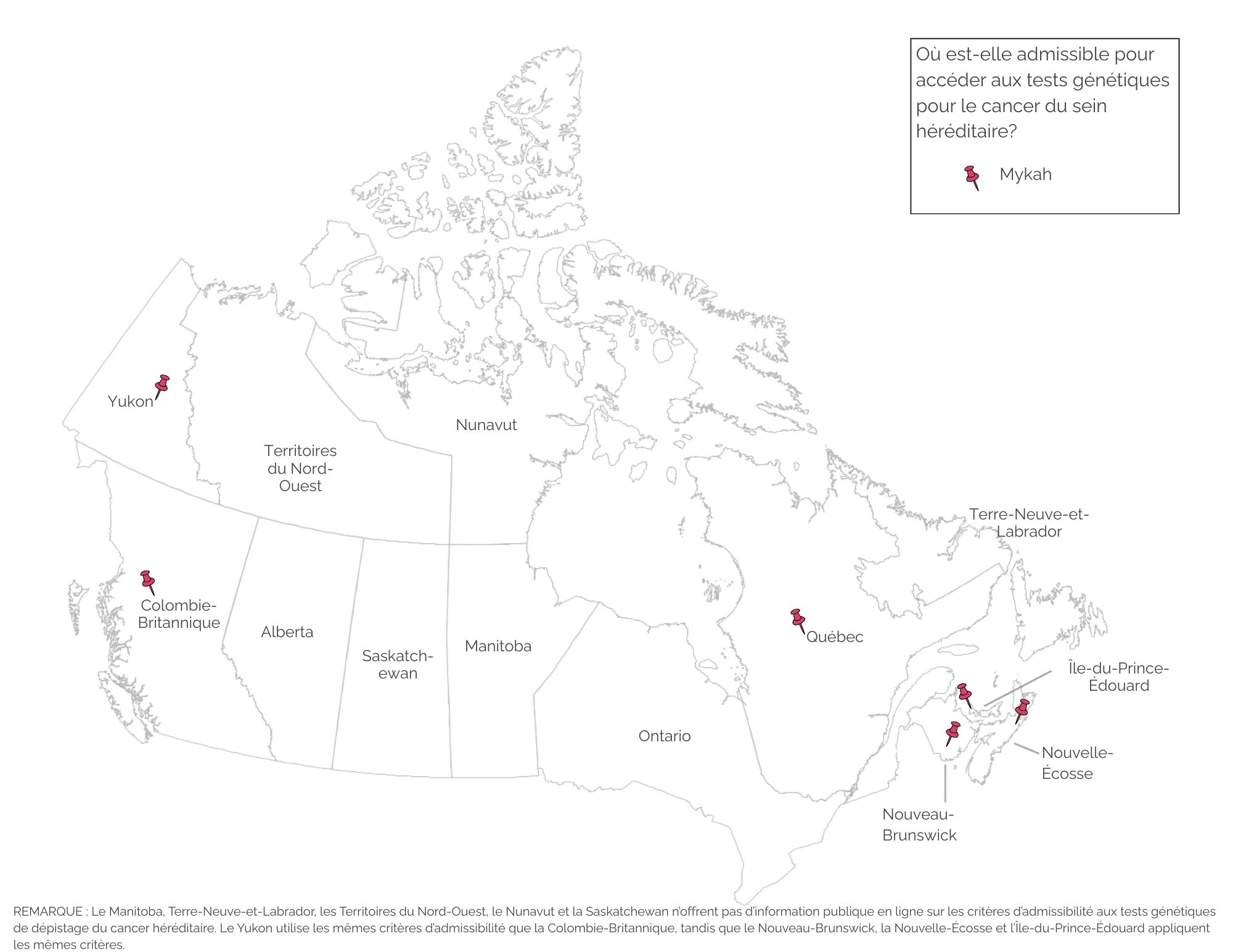 Selon les informations publiques disponibles concernant les critères d’admissibilité aux tests génétiques pour le cancer du sein héréditaire, Mykah peut réaliser un dépistage en Colombie-Britannique, au Nouveau-Brunswick, en Nouvelle-Écosse, à l’Île-du-Prince-Édouard, au Québec et au Yukon.