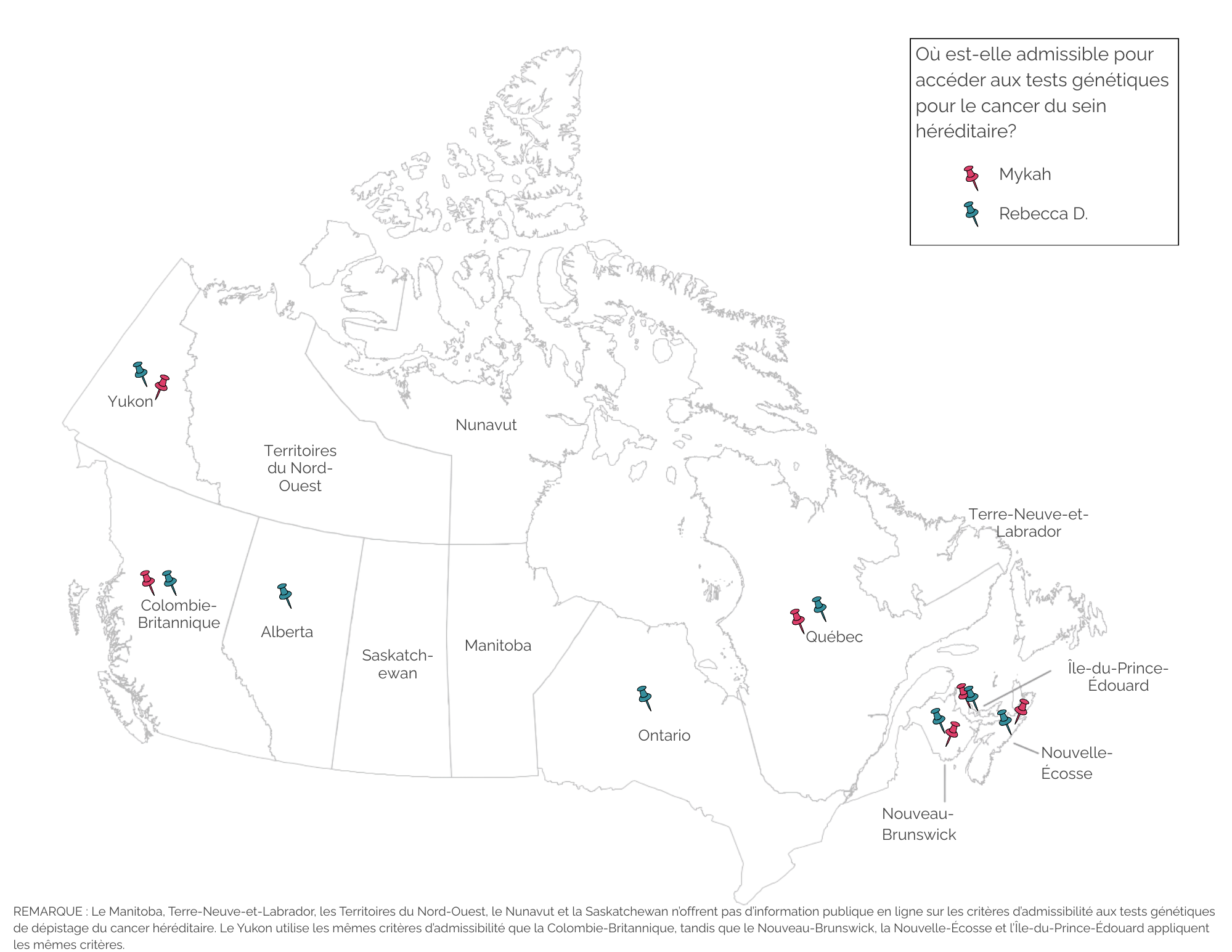 Selon les informations accessibles au public concernant les critères d’admissibilité aux tests génétiques pour le cancer du sein héréditaire, Rebecca peut y avoir accès en Alberta, en Colombie-Britannique, au Nouveau-Brunswick, en Nouvelle-Écosse, à l’Île-du-Prince-Édouard, en Ontario, au Québec et au Yukon.