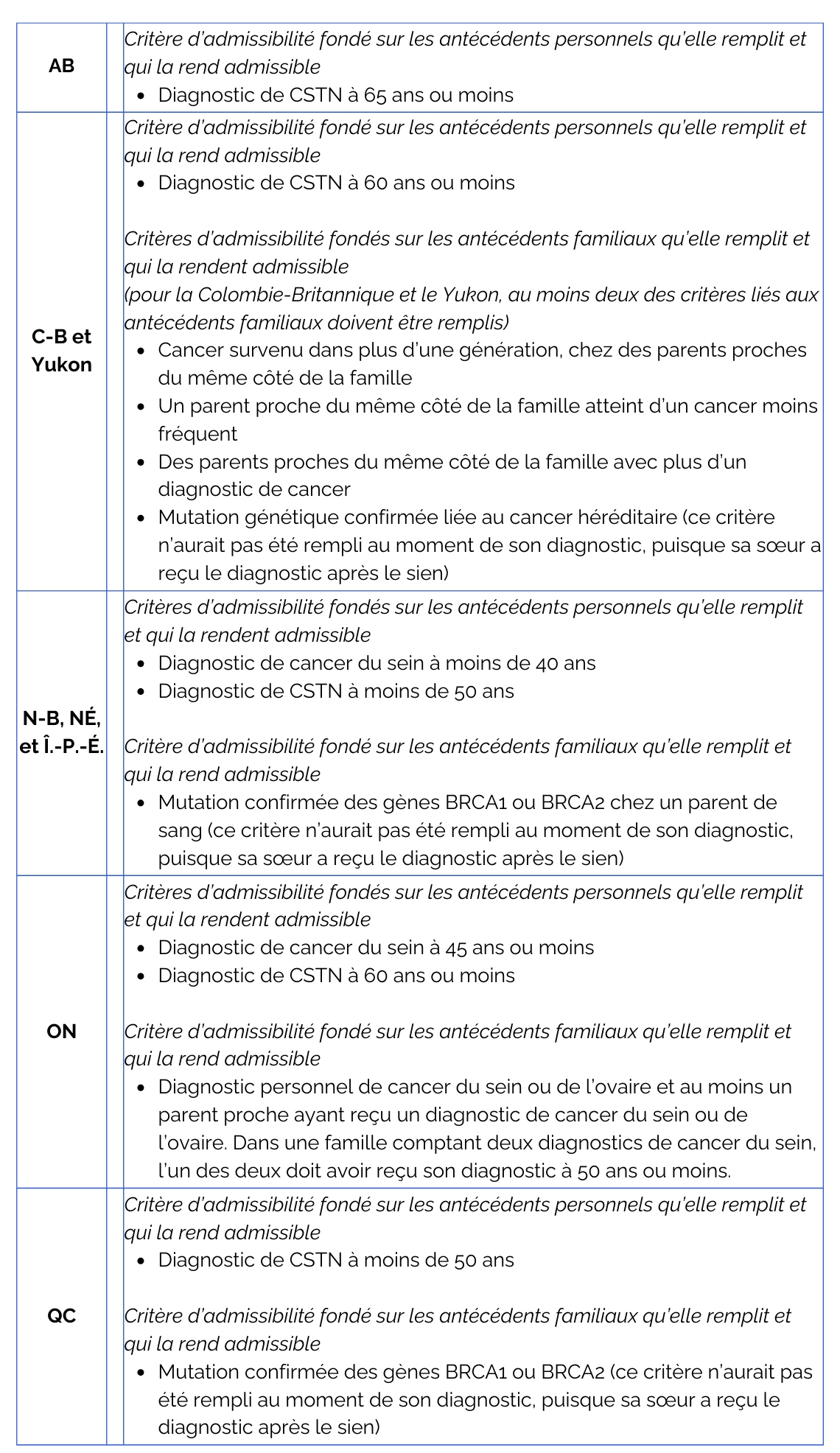 Où Rebecca est-elle admissible aux tests génétiques pour le cancer héréditaire au Canada?