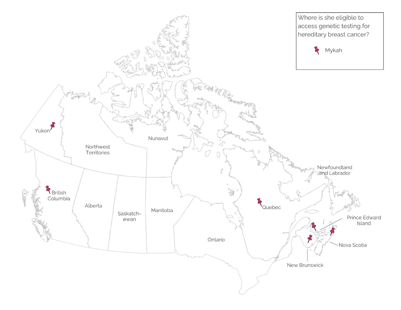 Based on publicly available information on the eligibility criteria to access genetic testing for hereditary breast cancer, Mykah is eligible to access testing in British Columbia, New Brunswick, Nova Scotia, Prince Edward Island, Quebec, and Yukon.