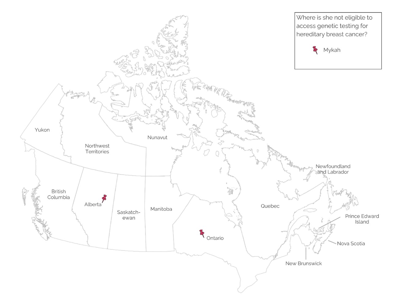 Based on publicly available information on the eligibility criteria to access genetic testing for hereditary breast cancer, Mykah is not eligible to access testing in Alberta and Ontario.