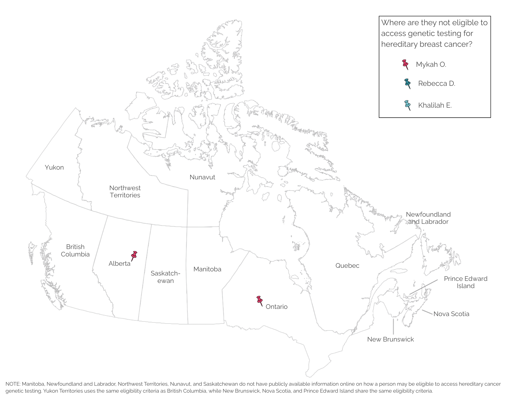 Based on the provinces and territories that share publicly available information on the eligibility criteria to access genetic testing for hereditary breast cancer, there isn’t a province or territory that Khalilah would not be currently eligible to access genetic testing in.
