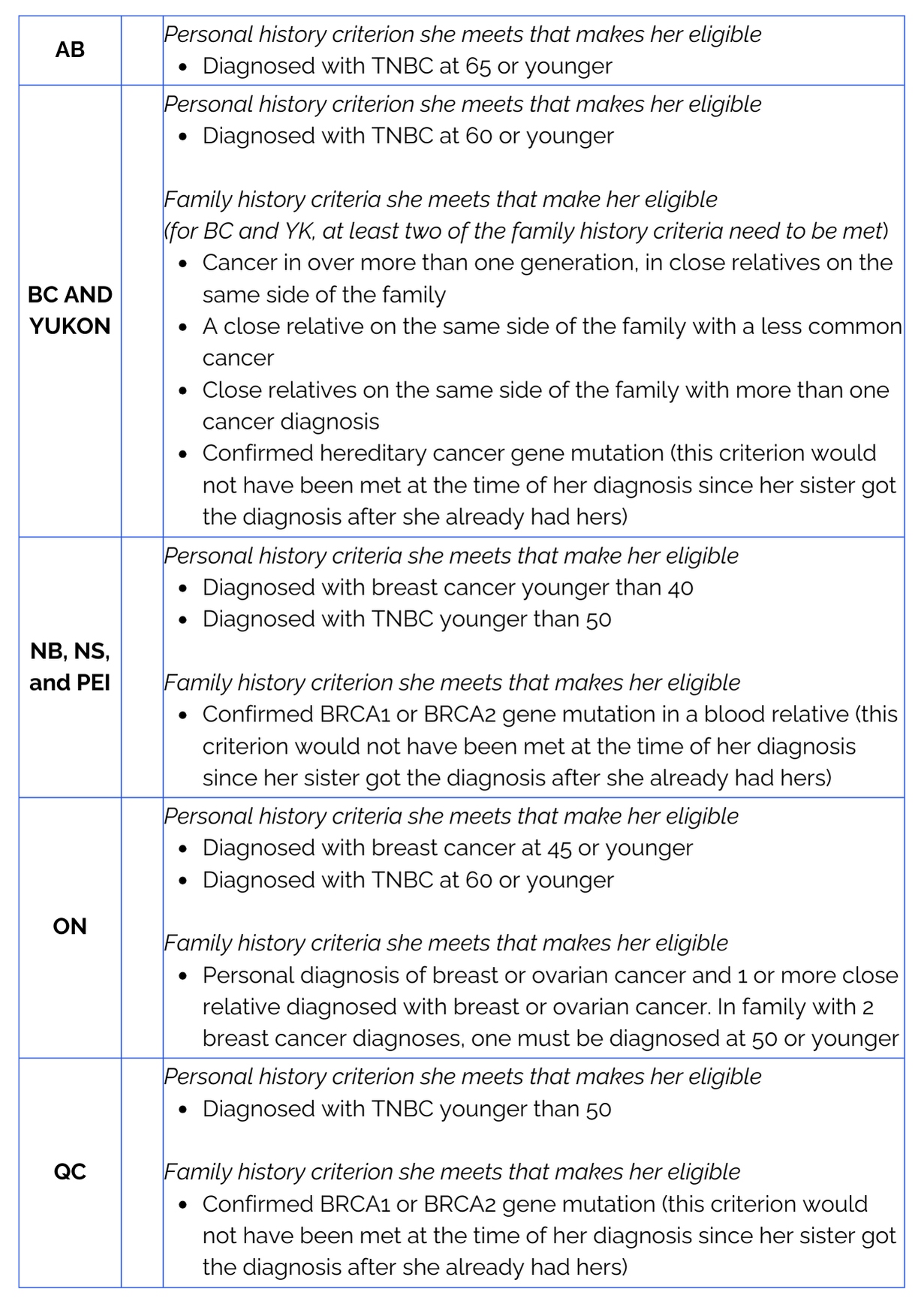 Additionally, where the five women we spoke may or may not be able to actually access genetic testing is just for illustrative purposes. We only show where they meet the eligibility criteria that has been set and made publicly available by each PTs. It does not reflect their actual access to genetic testing for hereditary cancer as there may be further access criteria. For example, in some places a person can get genetic testing automatically if they meet the criteria, while in others, a referral from a doctor might be needed. This was shown in Mykah’s case where she does not meet the eligibility criteria in Alberta, where she lives, but was still able to get tested, although with a lot of bumps along the way.
