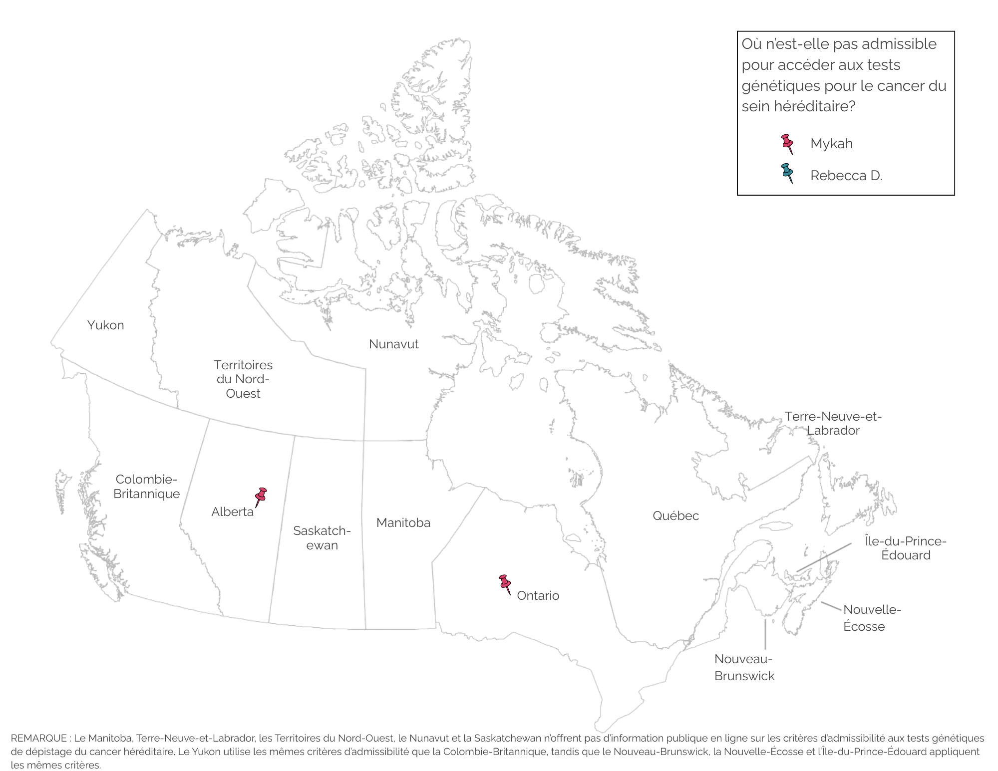Selon les informations accessibles au public concernant les critères d’admissibilité aux tests génétiques pour le cancer du sein héréditaire, Rebecca peut y avoir accès en Alberta, en Colombie-Britannique, au Nouveau-Brunswick, en Nouvelle-Écosse, à l’Île-du-Prince-Édouard, en Ontario, au Québec et au Yukon.