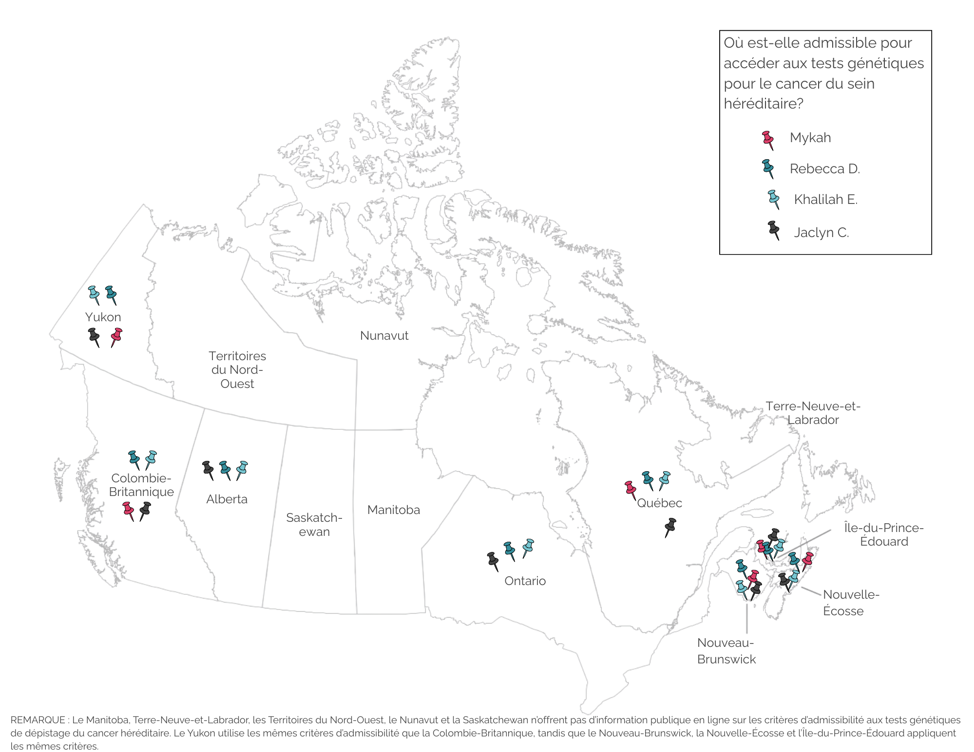 De nombreux critères d’accès aux soins de santé au Canada dépendent de l’endroit où l’on vit. L’accès aux tests génétiques pour le cancer héréditaire ne fait pas exception à la règle. Pour évaluer et illustrer cela, nous avons contacté les membres de notre communauté et discuté avec cinq femmes afin d’illustrer sur une carte les endroits où elles pourraient (ou non) y accéder à l’heure actuelle.