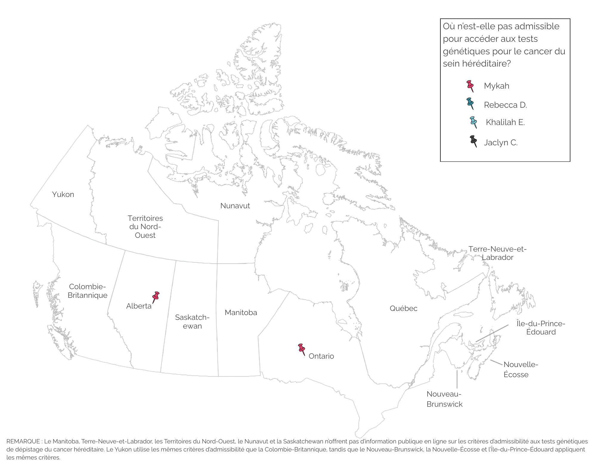 Le fait que les cinq femmes que nous avons rencontrées puissent ou non réellement accéder aux tests génétiques est donné à titre d’illustration uniquement. Nous ne présentons que les endroits où elles répondent aux critères d’admissibilité qui ont été fixés et rendus publics par chaque Province et Territoire. Cela ne reflète pas leur accès réel aux tests génétiques pour le cancer héréditaire, car d’autres critères d’accès peuvent s’appliquer. Par exemple, dans certains endroits, une personne peut automatiquement obtenir un test génétique si elle remplit les critères, tandis que dans d’autres, l’ordonnance d’un médecin est nécessaire. C’était le cas de Mykah : bien qu’elle ne remplissait pas les critères d’admissibilité en Alberta (son lieu de résidence), elle a tout de même pu se faire tester, mais a rencontré de nombreux obstacles en cours de route.